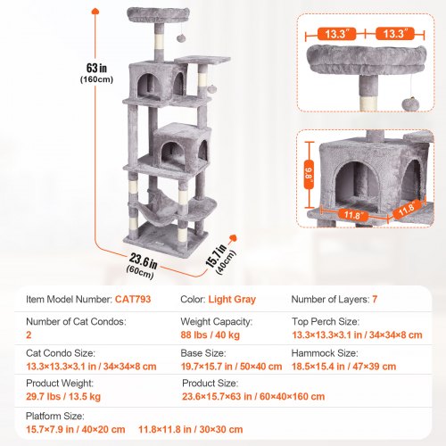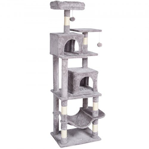 VEVOR Tiragraffi per Gatti da Interno, Torre per Gatti 160 cm 2 Cucce per Gatti, Amaca, Trespolo Superiore, Piattaforme per Saltare, Grande Centro Attività per Gatti con Palla Appesa, Grigio Chiaro