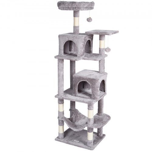 VEVOR Tiragraffi per Gatti da Interno 183 cm Torre per Gatti con 2 Cucce per Gatti, Amaca, Trespolo Superiore, Piattaforme per Saltare, Grande Centro Attività per Gatti con Palla Appesa, Grigio Chiaro