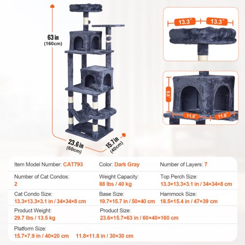 VEVOR Tiragraffi per Gatti da Interno, Torre per Gatti 160 cm 2 Cucce per Gatti, Amaca, Trespolo Superiore, Piattaforme per Saltare, Grande Centro Attività per Gatti con Palla Appesa, Grigio Scuro