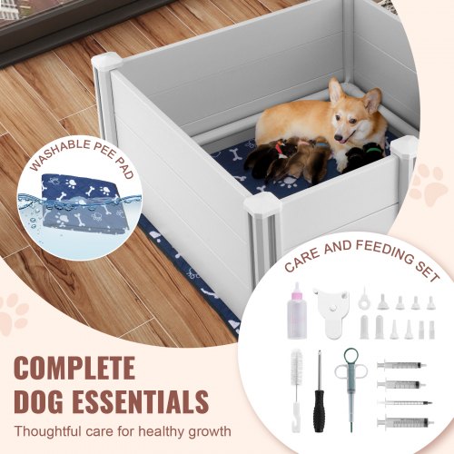 VEVOR Box per il Parto dei Cani, 98 x 98 x 46 cm Box Parto a per Cani e Cuccioli, Recinto per Parto Cuccioli con Sponde, Tappetini Lavabili per Pipì Lavabile Sacchetti Portaoggetti, Box Parto Bianco