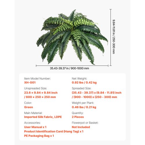 VEVOR Felci Artificiali 2 Pezzi, Diametro Naturale di ca.90 a 100 cm, Grandi Felci Artificiali di Boston Sospese, Decorazione da Parete con 35 Rami, Felce Finta per Casa e Ufficio, Vaso non Incluso
