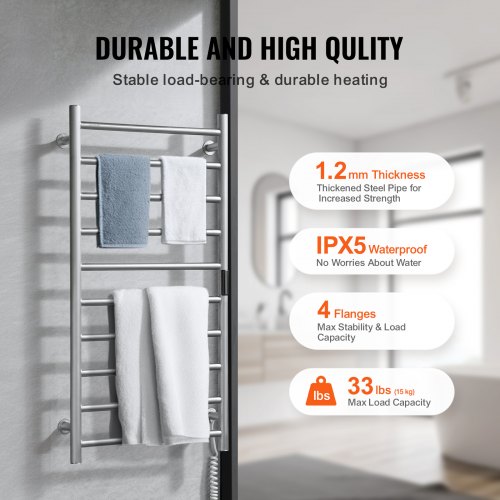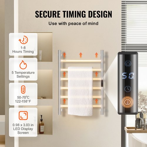 VEVOR Scaldasalviette a 4 Barre, Portasciugamani Riscaldato a Parete per Bagno, Scaldasalviette Impermeabile IPX5 con Timer e Display LED, Scaldasalviette con 5 Livelli di Temperatura Regolabili