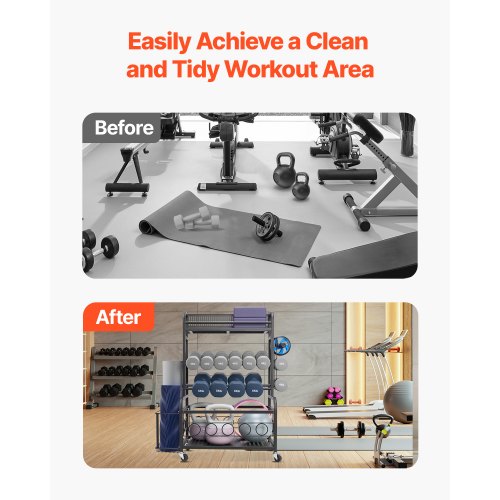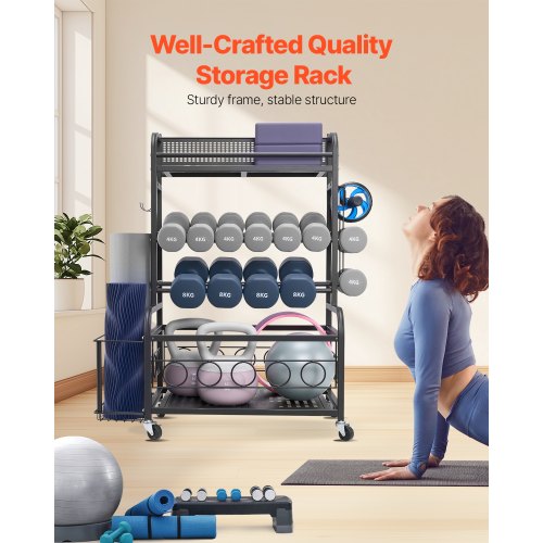 VEVOR Supporto per Tappetino da Yoga, Organizattore per Attrezzi da Palestra, Supporto in Acciaio Verniciato a Polvere con Ganci e Ruote, Supporto per Pesi per Manubri, Kettlebell, Foam Roller