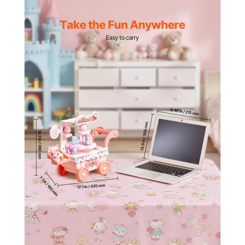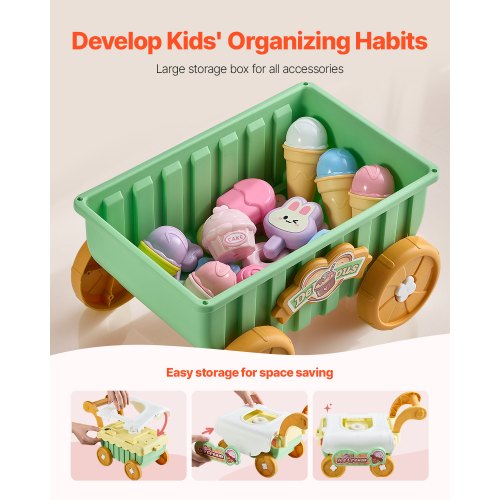 VEVOR Carretto dei Gelati per Bambini, con Accessori, Negozio di Finzione con Carrello Portaoggetti, Cono Gelato Ghiacciolo, Tenda da Sole, Congelatore, Cassetti Portaoggetti, Menu Capovolti