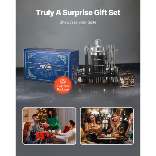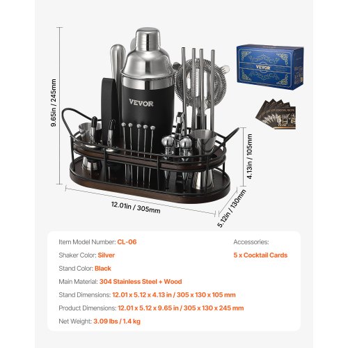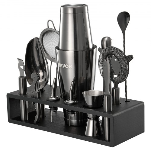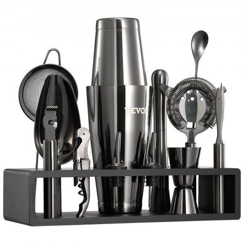 VEVOR Agitatore per Cocktail Set, 23 Pezzi Utensili in Acciaio Inox, Kit Barista Martini con Supporto Bambù Cucchiaio per Miscelatore, Pestello, Colino, Versatori per Liquori, Pinza per Ghiaccio
