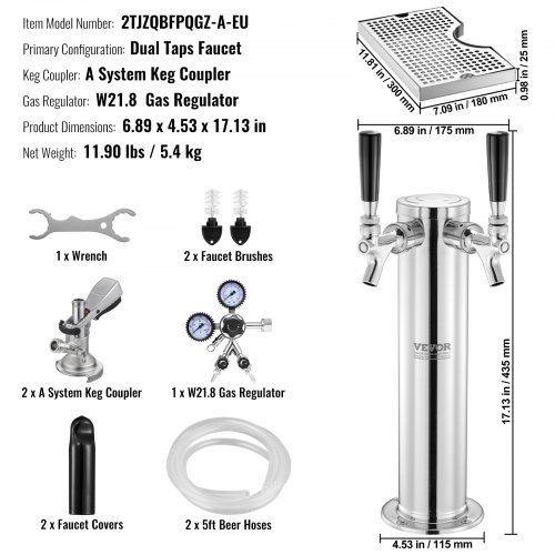 VEVOR Kit Conversione Birra Doppio Rubinetto, Distributore Torre Birra per Fusti in Acciaio Inossidabile Regolatore W21,8 Doppio Manometro Accoppiatore Fusti, Vassoio Gocciolamento Birra per casa