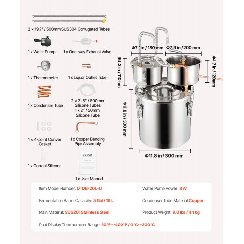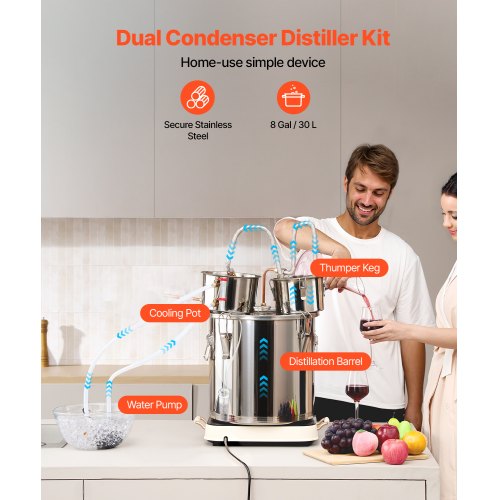 VEVOR Kit Distillatore per Alcol Pompa dell'Acqua, Kit di Fermentazione con Doppio Condensatore Distillazione Secondaria, Kit Distillatore Serbatoio Fai da te Capienza 50 L per Bevande Alcoliche
