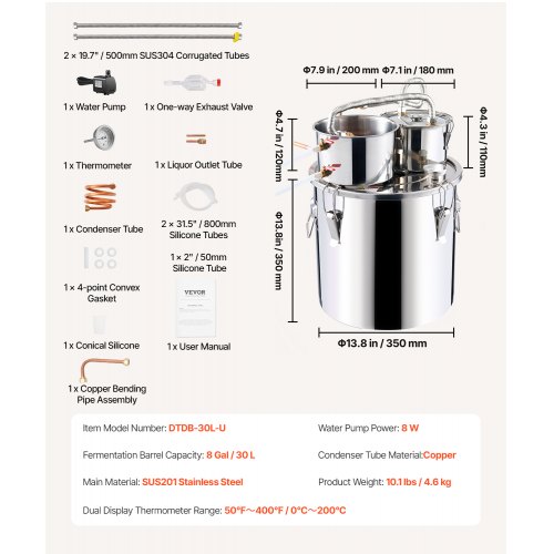 VEVOR Kit di Distillatore Elettrico Alcol in Acciaio Inox Capienza 50L Potenza Nominale 2800W con Pompa dell'Acqua Potenza 6,8 - 8W, Alambicco Distillatore in Acciaio Inox Uso Alimentare Acqua Alcol