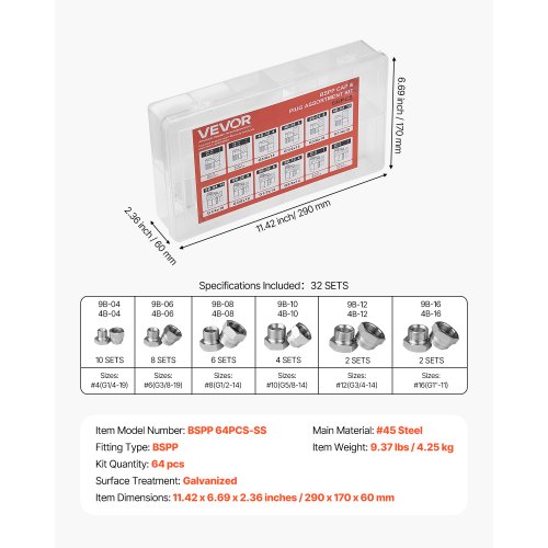 VEVOR Raccordi Idraulici BSPP 290 x 170 x 60 mm Kit Tappo e Tappo Idraulico con Filettatura di Precisione, 64 Pezzi, per Impieghi Gravosi in Acciaio Zincato, Misure Trattino 04/06/08/10/12/16