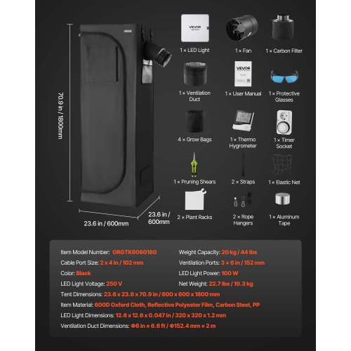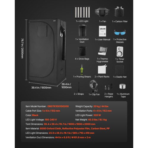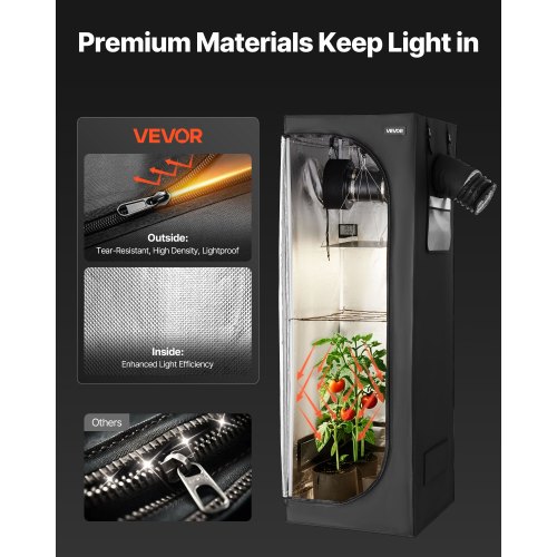 VEVOR Kit Completo per Tenda Idroponica Coltivazione da Interno 80x80x180 cm, Tenda da Coltivazione con Illuminazione LED a Spettro Completo, Sistema di Ventilazione, Mylar Riflettente