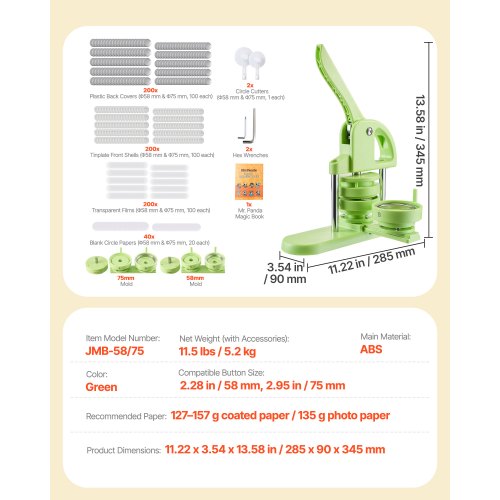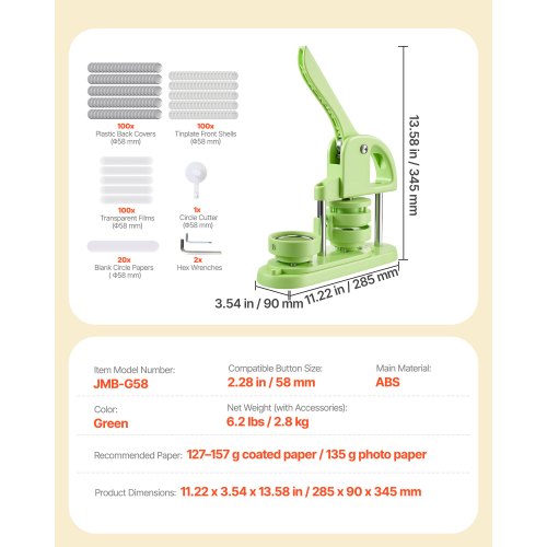 VEVOR Macchina per Spille, Macchina Punzonatrice 200 pezzi Kit per Fustellatrice Manuale per Badge 58/75 mm, Impugnatura Ergonomica, per Spille Personalizzate Fai da te, Verde