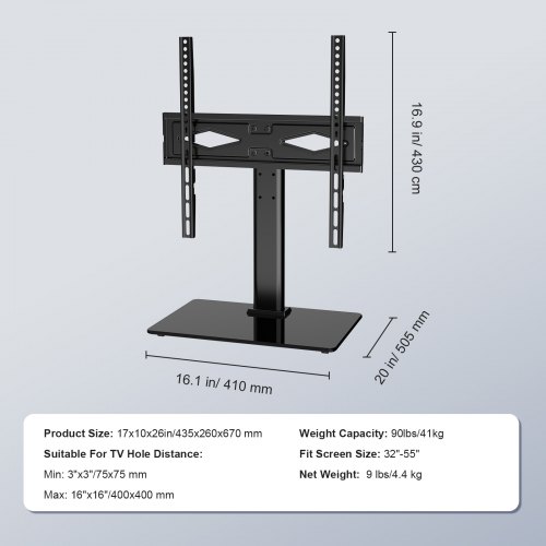 VEVOR Supporto per Televisori da Banco Base in Vetro Temperato Altezza Regolabile tra 615-670mm, Porta TV 32-55 pollici Compatibile con VESA Carico Max. 41kg, Supporto per TV da Banco 435x260x670 mm