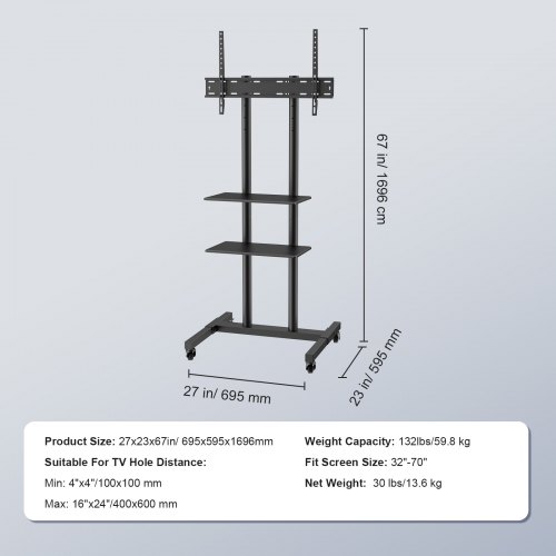 VEVOR Carrello Porta TV con Ruote per Schermo da 812,8-1778 mm Carico max. 45 kg Carrello Porta TV Rotazione Sinistra-Destra 25° Altezza Regolabile con Ripiano per Angolo da Casa Ufficio