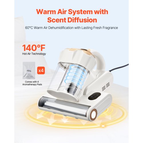 VEVOR Aspirapolvere per Materassi, 550 W con Cavo, Aspirazione Potente da 18 Kpa, Doppio Contenitore per Polvere, Filtro HEPA e Riscaldamento, Tecnologia a Ultrasuoni e Luci, Bianco