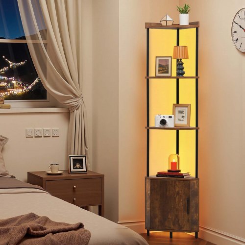 VEVOR Scaffale Angolare a 5 Ripiani, Scaffale ad Angolo con Luce LED e Ante, Mensole da Parete, Struttura in Metallo e Ripiani in Legno, Libreria Stretta per Casa e Ufficio, Marrone Rustico