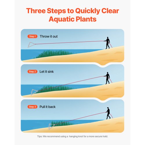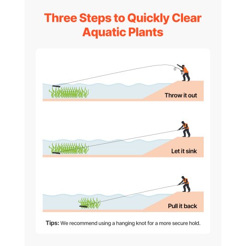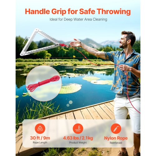VEVOR Rastrello per Erbacce Acquatiche 515 x 540 x 9 mm Rastrello per Erbacce per Laghi a 3 Lati con Manico, Tagliaerba Galleggiante Lanciabile in Acciaio Inox con Corda da 9 m per Laghi e Stagni
