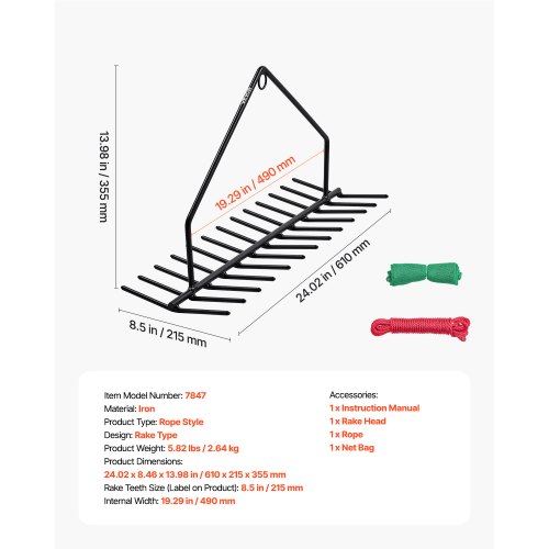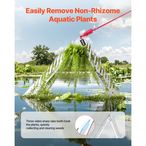VEVOR Rastrello per Erbacce Acquatiche 610 mm Rastrello per Erbacce per Laghi a Doppia Faccia 215 mm Taglierino per Erbacce da Stagno con Corda da 9 m Foro di Fissaggio, per Pulizia di Ninfee e Fanghi