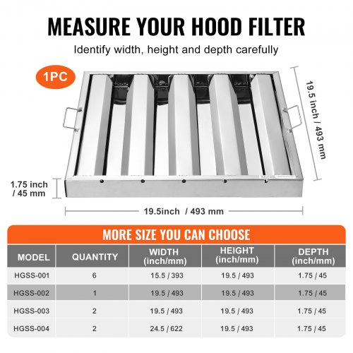 VEVOR Filtro per Cappa Commerciale, 493L x 493A x 45P mm, Filtro Deflettore per Cappa da Cucina in Acciaio Inox per Cappe di Scarico da Cucina con Classificazione Antigrasso, 4 Scanalature, 1 Pezzo