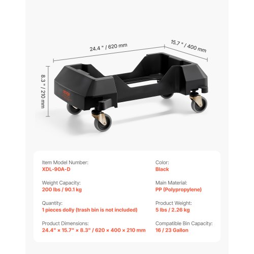 VEVOR Carrello per Bidoni della Spazzatura, con 4 Ruote Bloccabili, Capacità di Peso di 90,1 kg, Base a Rulli Rotonda, Carrello per Barili per Impieghi Gravosi in Plastica 455 x 155 mm Nero