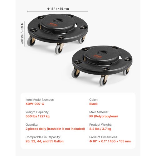 VEVOR Carrello per Bidoni della Spazzatura, con 4 Ruote Bloccabili, Capacità di Peso di 227 kg, Base a Rulli Rotonda, Carrello per Barili per Impieghi Gravosi 455 x 155 mm Nero 2 Pezzi