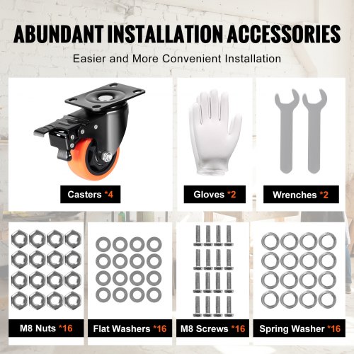 VEVOR Ruote Girevoli Set di 4 Ruote per Mobili Industriali Ruote in PVC da 50,8 mm con Doppio Freno di Bloccaggio Capacità di Carico Massima 68 kg per Carrelli Banco da Lavoro, Set di Ruote Girevoli