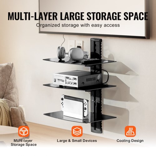 VEVOR Supporto Multimediale Scaffale Galleggiante per Proiettore con 3 Ripiani, Mensola a Parete Multimediale, Supporto a Parete per Audio, Rack di Stoccaggio Multimediale Regolabile per Lettori DVD/Decoder via Cavo/Console di Gioco, Nero