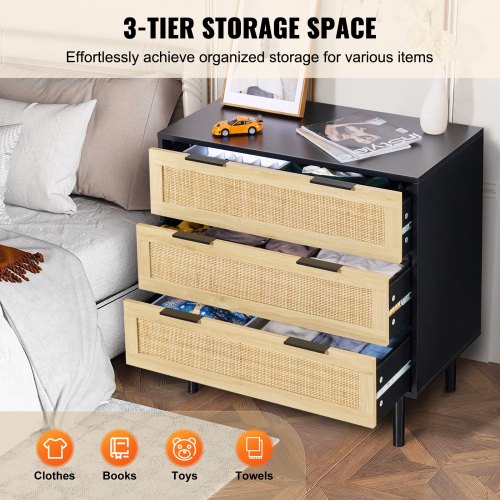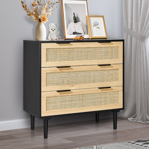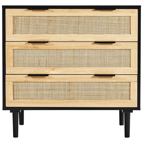 VEVOR Cassettiere in Legno di Rattan Naturale con 3 Cassetti, Moderna Cassettiera in Legno per Vestiti e Contenitori Boho con Maniglie e Gambe Robuste, per Camera da Letto Soggiorno e Corridoio