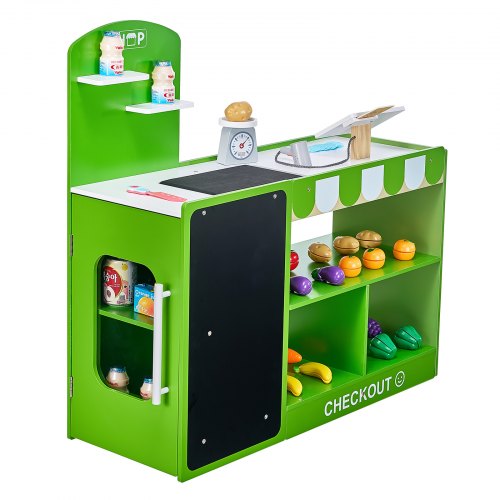 VEVOR Set da Gioco per Bambini in Legno con Tende, Negozio di Giocattoli Reversibile, Negozio di Alimentari Bifacciale con Lavagna e Registratore di Cassa, Bancarella del Mercato per Bambini