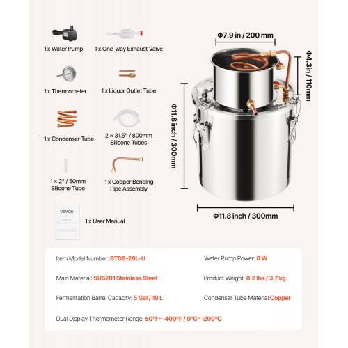 VEVOR Kit di Distillatore Alambicco in Acciaio Inox Rame Puro Materiale per Uso Alimentare Capienza del Serbatoio 19L, Kit Distillatore 30 x 30 cm per Liquore Acqua Distillata Vino con Pompa d'Acqua