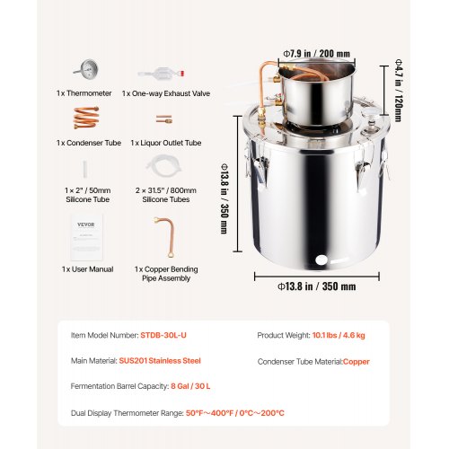 VEVOR Alambicco Distillatore in Acciaio Inox 304 Capacità di Barile 30L per Acqua Distillata Liquore Grappa Whisky Vodka Vino, Alambicco per Distillazione in Acciaio Inossidabile 304 Uso Domestico 30L