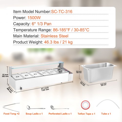 VEVOR Scaldavivande Commerciale con 6 Recipienti (5,5 L / 1/3 Dimensioni Ciascuno) Tavolo a Vapore Elettrico con Copertura in Vetro 1500 W Scaldavivande da Tavolo, Controllo della Temperatura 30-85 °C