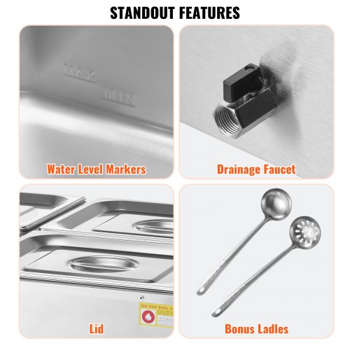 VEVOR Scaldavivande Commerciale da Banco Scaldavivande Elettrico a Vapore con 4 Contenitori (1/4 Dimensione) 1200 W in Acciaio Inox Temperatura tra 30 e 80 °C per Catering, Buffet Feste