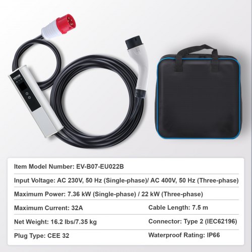 VEVOR Caricabatterie per Veicoli Elettrici Portatile Corrente Max.32A Monofase Tipo 2 Lunghezza Cavo 7,5m, Caricabatterie EV Portatile Impermeabilità Schermo LCD IP66 Potenza 7,36kW/22kW Controllo APP
