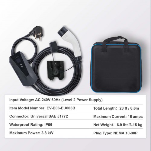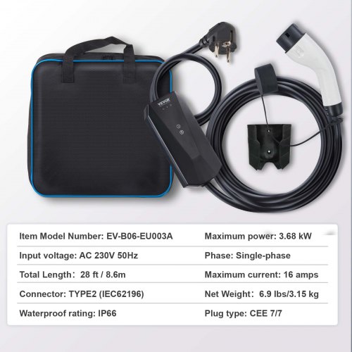 VEVOR Caricabatterie per Veicoli Elettrici Portatile Corrente Max. 16A Monofase Tipo 2 Lunghezza Cavo 8,6m, Caricabatterie EV Portatile Impermeabilità IP66 Controllo APP Potenza Massima 3,68 kW 230V