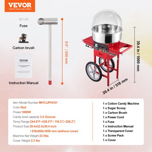 VEVOR Macchina Elettrica per Zucchero Filato, Macchina Commerciale con Coperchio Carrello, Ciotola Acciaio Inossidabile, Paletta Zucchero, Compleanno di Bambini, Feste in Famiglia, Rosso, 1000 W