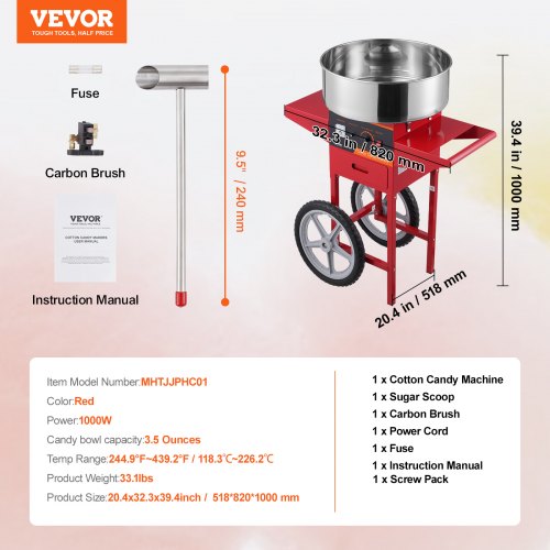 VEVOR Macchina Elettrica per Zucchero Filato, Macchina per Zucchero Filato Commerciale 1000 W con Ciotola in Acciaio Inox 52 cm, Misurino per Zucchero Cassetto, per Compleanni, Feste, Rosso