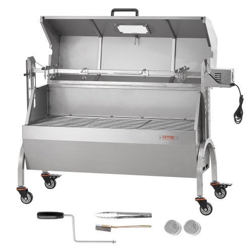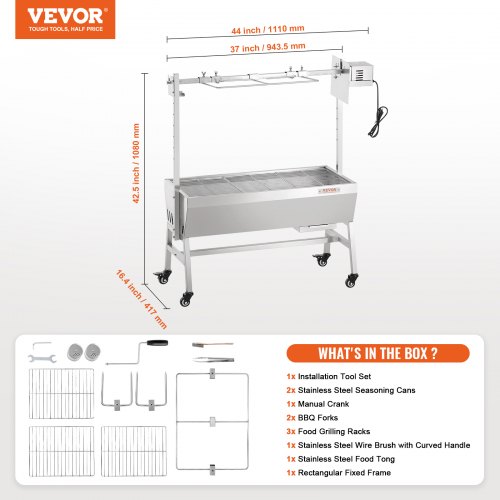 VEVOR Girarrosto Spiedo BBQ Motore 9W Lunghezza di Spiedo 100,6cm in Acciaio Inox Carico Max.12 kg, Kit Girarrosto Spiedo Velocità 4 giri/min Forchetta Larghezza 18cm, Spiedo per Festa Evento Esterno
