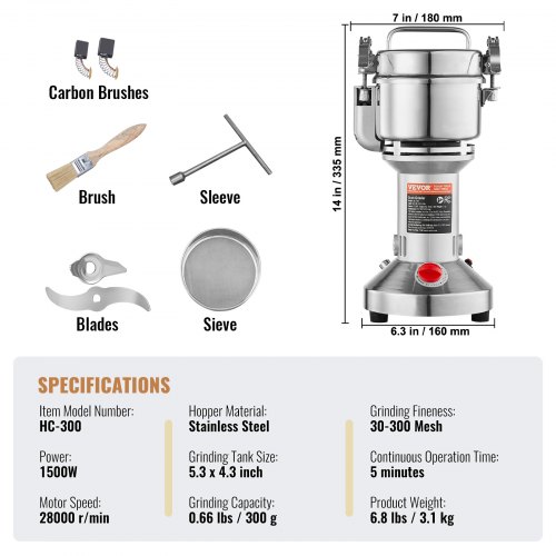 VEVOR Mulino Elettrico da Banco per Macina Spezie Cereali Alimenti Secchi Capienza max. da 300g Acciaio Inox Velocità 25000 giri/min, Mulino Elettrico 35x15cm per Cereali Spezie Erbe Orzo Macinacaffè