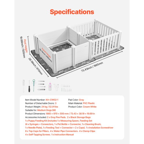 VEVOR Cassetta per Parto di Cani da 2370 x 1230 x 460 mm Recinto per Cuccioli da Interno con Porta Regolabile in Altezza e Tappetino Lavabile per Pipì, per Cani di Taglia XL, Bianco Latte