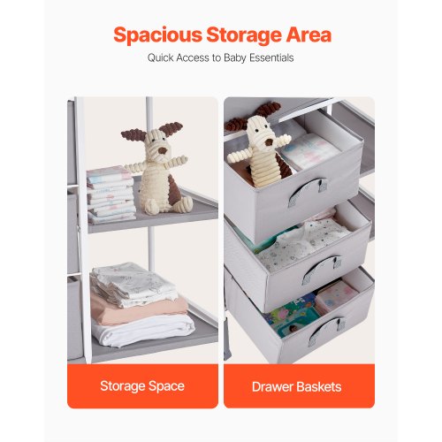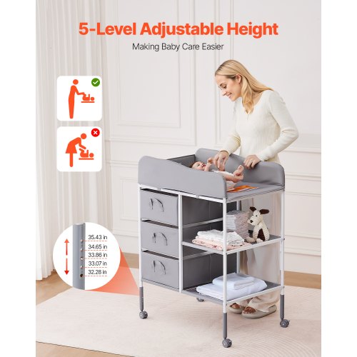 VEVOR Fasciatoio per Neonati, Stazione Portatile Multifunzionale per il Cambio del Pannolino con 3 Cassetti in Tessuto e Ruote Bloccabili, Altezza Regolabile, per la Cameretta dei Bambini, Grigio