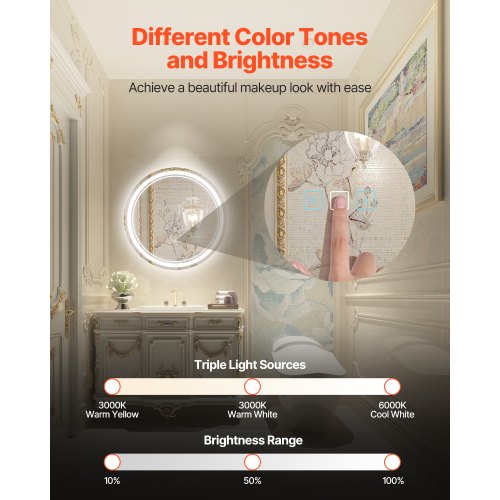 VEVOR Specchio Rotondo da Bagno a LED 60 cm, Montaggio a Parete con Illuminazione Frontale e Retroilluminata, Specchio Antiappannamento con Memoria Luci, Specchio Dimmerabile con Temperatura 3 Colori