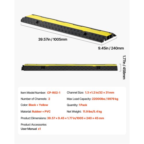 VEVOR Rampa di Protezione per Cavi, Capacità di 9979 kg /Asse, Tubo Flessibile in Gomma a 2 Canali, Canale da 32 x 31 mm, Dosso Rallentatore con Coperchio Superiore Apribile, 1 Confezione