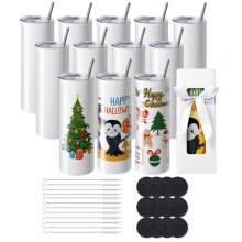 VEVOR Confezione da 12 bicchieri per sublimazione, Bicchiere vuoto da 591,5 ml, Bicchieri a doppia parete in acciaio inossidabile con cannuccia, Coperchio, Pennello, Base, Pellicola Termoretraibile
