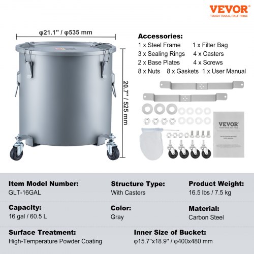 VEVOR Secchio per Grasso di Friggitrice, Contenitore per Smaltimento Olio da 16 Gal, Rivestimento in Acciaio al Carbonio, Contenitore per Il Trasporto dell'Olio Coperchio, Clip di Chiusura, Grigio
