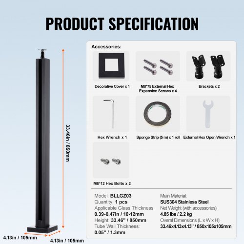 VEVOR Morsetto per Vetro, Staffa per Ringhiera in Vetro Altezza 850 m Spessore 10 mm-12 mm Morsetto per Montaggio su Vetro in Acciaio Inossidabile 304, per Balcone, Giardino, Terrazza, Scale, Nero