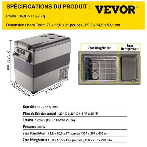 VEVOR Congelatore per Frigorifero Elettrico Portatile, Capacità 55 L Piccolo Frigorifero Congelatore 27,1 x 13,6 x 20,6 Pollici Mini Frigorifero per Auto Guida Viaggi Potenza Totale in Ingresso 45 W