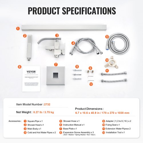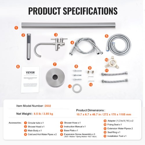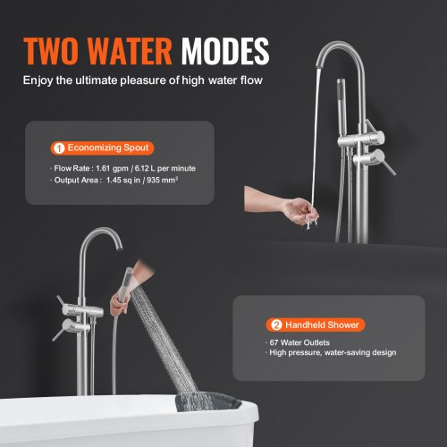 VEVOR Rubinetto per vasca da bagno indipendente, montaggio a pavimento, miscelatori per doccia, due modalità d'acqua, bocca girevole a 360°, Pulizia Scarichi Sciacquone 27,2 x 17 x 118,5 cm