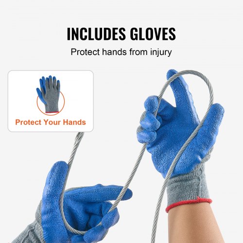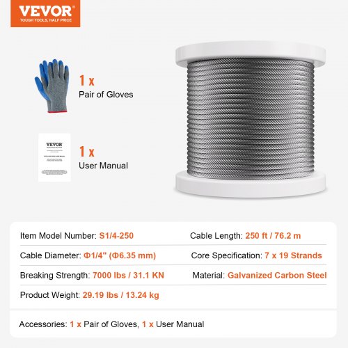 VEVOR Cavo Metallico da 6,35 mm 76,2 m Cavo in Acciaio al Carbonio Zincato a Caldo con Guanti, Resistenza alla Rottura di 31,1 KN 7 x 19 Fili, Grado Aeronautico Marino per Corrimano, Scale, Terrazze