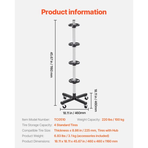 VEVOR Supporto Porta Pneumatici da Parete, Supporto per Pneumatici Regolabile 787-1440 mm in Acciaio Q235 per Pneumatici Standard da R355,6 a R508 mm Capacità Carico max. 181 kg da Officina Garage