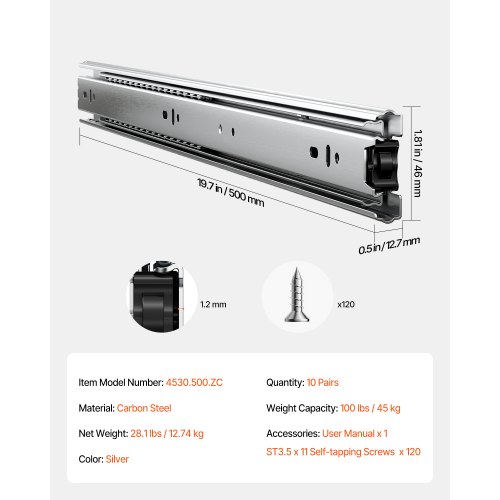 VEVOR Guide per Cassetti, 10 Paia di Guide per Mobili, con Cuscinetti a Sfera a Estensione Completa, Capacità di Carico di 45 kg per Montaggio Laterale per Impieghi Gravosi, 500 mm